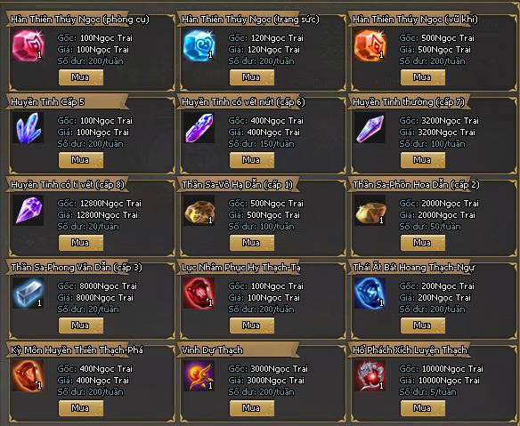 | Huyền Tinh Cấp 8 | 12800 | Cường hóa trang bị |
