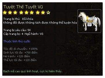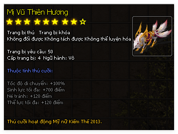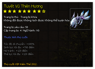 | Thú Cưỡi | Tuyết Vũ Thiên Hương (60 Ngày) | Mị Vũ Thiên Hương (60 Ngày) | Tuyệt Thế Tuyết Vũ (60 Ngày) |